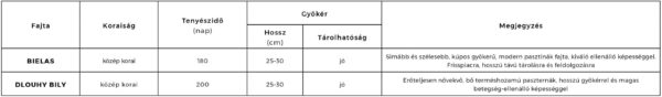 Bőtermő, kései fajta. Jellemzője, hogy hosszú, fehér jól tárolható gyökeret terem.